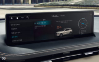 | 제네시스 인포테인먼트 시스템(14.5인치 디스플레이, Genesis Connected Services, 폰 프로젝션, 도로파손/미끔럼 지역 알림, 블루투스 멀티커넥션, 제네시스 카페이, 발레모드, 뮤직 스트리밍 서비스), 내비게이션 무선 업데이트, 9 스피커, 앞좌석 & 뒷좌석 USB 단자 |