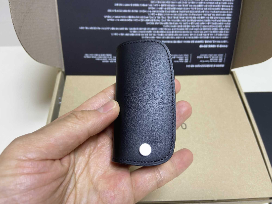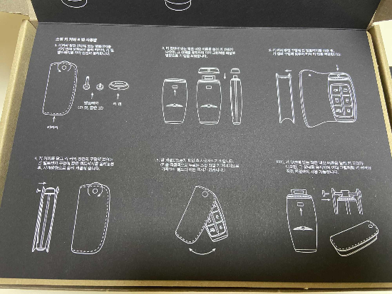 스마트키를 보호해줄 수 있는 가죽 케이스다. 설명서를 보고 스마트 케이스를 간편하게 낄 수 있다. 고급스러움이 느껴지는 검정 가죽에 민무니 케이스이다.