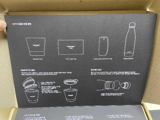 악세사리 박스 안에는 인슐레이트 컵, 보온컵, NFC 카드키, 스윙키 커버 & 캡 (스마트키 케이스)가 들어있다. 제네시스 마크가 들어가 있고 굉장히 고급스러움이 느껴지는 악세사리이다. 박스 위에 악세사리의 설명과 사용방법이 자세하게 적혀 있다.