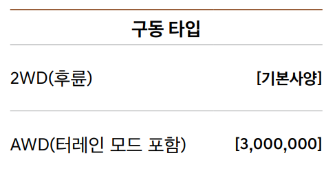 그럼에도 불구하고 AWD 사륜구동의 힘 있는 주행과 빠른 속도에서도 안정적인 주행을 원한다면 AWD 옵션 추가를 추천한다.