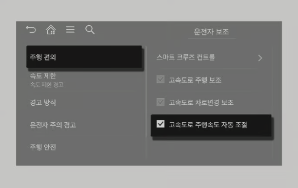 시동이 켜진 상태에서 인포테인먼트 시스템의 설정 메뉴에서 운전자 보조 → 주행 편의 → 고속도로 주행속도 자동 조절을 선택하면 내비게이션 기반 스마트 크루즈 컨트롤 기능이 켜집니다.