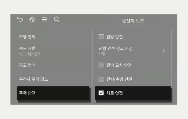 시동이 켜진 상태에서 인포테인먼트 시스템의 설정 메뉴에서 주행 안전 → 차로 안전을 선택하면 차로 이탈방지 보조 시스템을 설정하거나 해제할 수 있습니다.