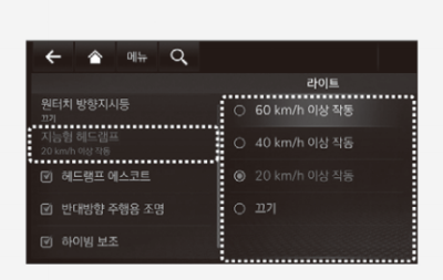 지능형 헤드램프를 설정하기 위해서는 시동이 켜진 상태에서 인포테인먼트 시스템의 설정 → 차량 → 라이트 → 지능형 헤드램프에서 원하는 속도를 선택한다.