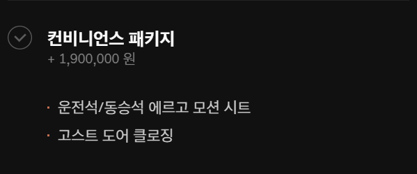 제네시스 G80 컨비니언스 패키지는 190만 원으로 운전석 & 동승석 에르고 모션시트 (18방향, 쿠션 익스텐션, 볼스터 전동 조절 적용, 스트레칭 모드 포함), 고스트 도어 클로징 기능을 포함한다.