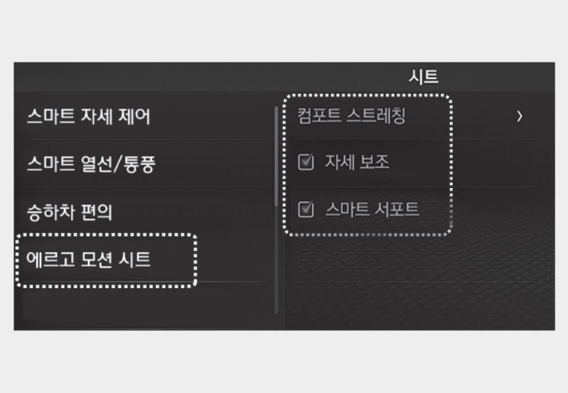 기능을 켜려면 인포테인먼트 시스템의 설정 → 차량 → 시트 → 에르고 모션 시트 → 스마트 서포트를 차례로 선택하면 된다.