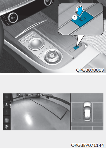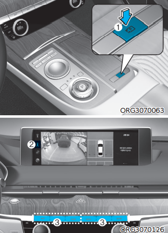 주차/뷰 버튼 ①을 누르면 서라운드 뷰 모니터를 켜거나 끌 수 있다. 서라운드 모니터의 뷰 전환 버튼 ②를 눌러 여러 가지 뷰 모드로 전환 가능하다. 인포테인먼트 시스템의 버튼 ③을 눌러 R 후진단 외 서라운드 뷰 모니터를 해제할 수 있다.