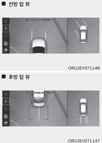 탑 뷰 주차 가이드 항목이 체크되어 있는 경우, 서라운드 뷰 모니터 화면 우측의 탑 뷰에는 탑 뷰 주차 가이드가 표시된다. 탑 뷰 주차 가이드 항목은 전방 탑 뷰, 후방 탑 뷰의 가이드라인 표시와도 연동된다.