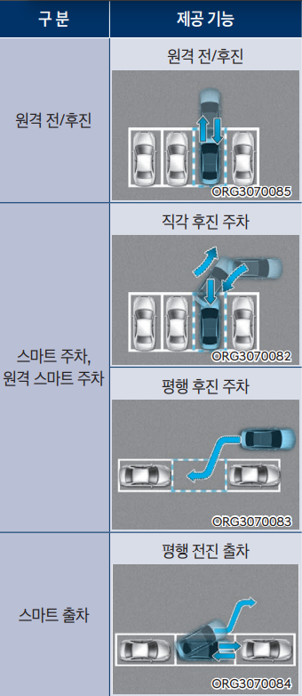 원격 전/후진 기능, 원격 스마트 주차 기능은 운전자가 차량 밖에서 스마트 키를 이용하여 기능을 작동할 수 있다. 스마트 주차 기능, 스마트 출차 기능은 운전자가 차량 안에서 기능을 작동할 수 있다. 스마트 주차와 원격 스마트 주차 기능은 직각 후진 주차와 평행 후진 주차를 돕는다.