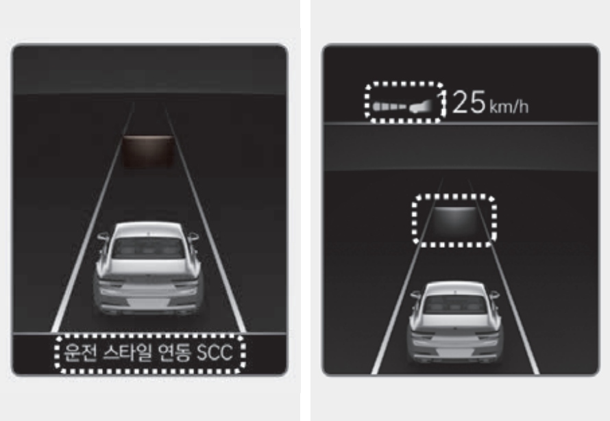 운전 스타일 연동이 작동하면 계기판에 '운전 스타일 연동 SCC' 문구가 2초 동안 표시되고, 운전자의 주행 성향이 반영된 차간거리 단계 및 목표 차간거리가 표시된다.