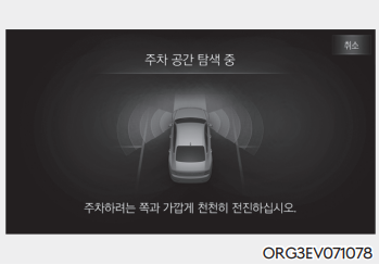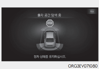 정차한 상태에서 차량 센서로 주변을 감지하여 평행 출차 가능한 공간을 탐색한다. 원격 스마트 주차 보조가 출차 공간 탐색을 완료하면 알림음과 함께 출차 공간 탐색 완료 안내문을 인포테인먼트 시스템 화면에 표시한다.
