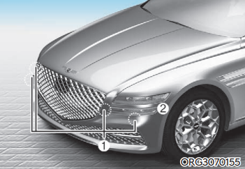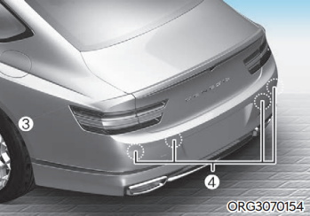 제네시스 G80 원격 스마트 주차 보조 기능은 ① 전방 초음파 센서, ② 전측방 초음파 센서, ③ 후측방 초음파 센서, ④ 후방 초음파 센서를 이용하여 작동한다.