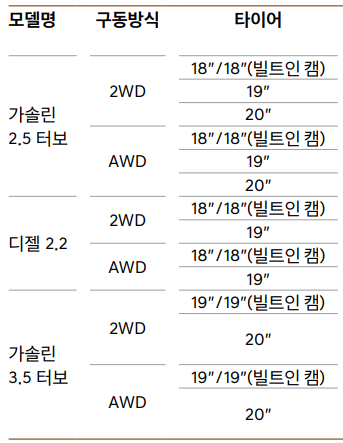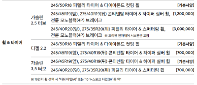 | 가솔린 2.5 터보 | 콘티넨탈 타이어 & 하이퍼 실버 휠 | 콘티넨탈 타이어 & 하이퍼 실버 휠 / 전륜 모노블럭(4p) 브레이크 | 피렐리 타이어 & 스퍼터링 휠 / 전륜 모노블럭(4p) 브레이크 / 프리뷰 전자제어 서스펜션 |