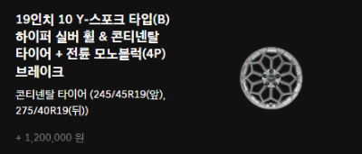 | 가솔린 3.5 터보 | - | 콘티넨탈 타이어 & 하이퍼 실버 휠 | 피렐리 타이어 & 스퍼터링 휠 |