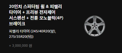 | 가솔린 3.5 터보 선택 | 660만 원 | 프리뷰 전자제어 서스펜션 19인치 컨티넨탈 타이어 & 휠 전륜 모노블럭(4P) 브레이크 |