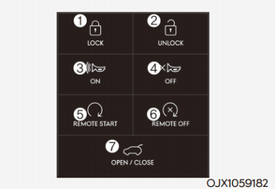 ① 도어 잠금 ② 도어 잠금 해제 ③ 비상경보 (알람) 켜짐 ④ 비상경보 (알람) 꺼짐 ⑤ 원격 시동 켜짐 ⑥ 원격 시동 꺼짐 ⑦ 테일게이트 열림/닫힘