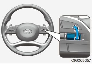스티어링 휠의 + 스위치를 짧게 밀어 올릴 때마다 1km/h씩 설정 속도가 증가한다.