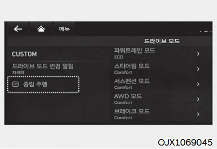 인포테인먼트 시스템의 설정 메뉴에서 드라이브 모드 → 중립 주행을 설정하면 중립 주행 기능이 작동한다. 설정을 해제하면 기능이 꺼진다. 중립 주행 기능이 작동하면 계기판에 중립 주행 문구를 표시한다.