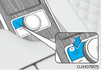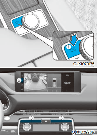 시동이 켜진 상태에서 작동한다. 15km/h 이상 속도로 주행할 때 주차/뷰 버튼 ① 을 누를 경우 주행 중 후방 뷰가 표시된다. 15km/h 이하의 속도로 주행할 때 서라운드 뷰 모니터 화면의 주행 중 후방 뷰 버튼 ②를 누를 경우 주행 중 후방 뷰 화면으로 변경된다.