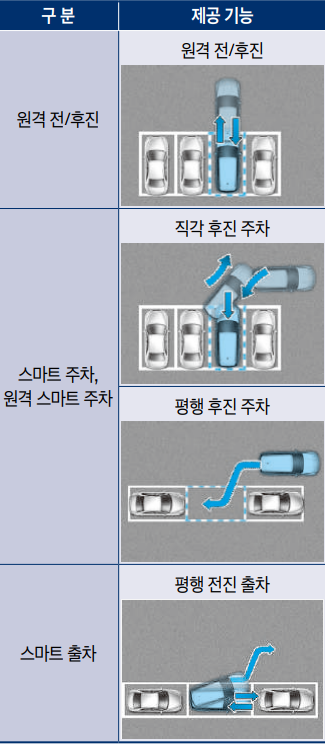 원격 전/후진, 직각 후진 주차, 평행 후진 주차, 평행 전진 출차의 기능을 이용할 수 있다. 원격 스마트 주차 보조 기능은 차량에 탑승하여 주차/뷰 버튼 및 주차 안전 버튼을 이용하거나 차량 외부에서 스마트 키를 사용하여 이용이 가능하다.