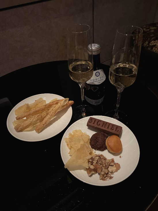 간단한 다과와 음료가 제공되는 시간은 아침, 점심, 저녁 3개의 타임으로 운영된다. 2시부터 살롱 드 시그니엘 라운지에서 커피, 차, 음료를 마실 수 있으며 간단한 과자 및 견과류를 함께 먹을 수 있다. 5시부터 이용 가능한 이브닝 라운지는 샴페인과 음료를 마실 수 있으며 간단한 과자 및 안주를 제공한다.