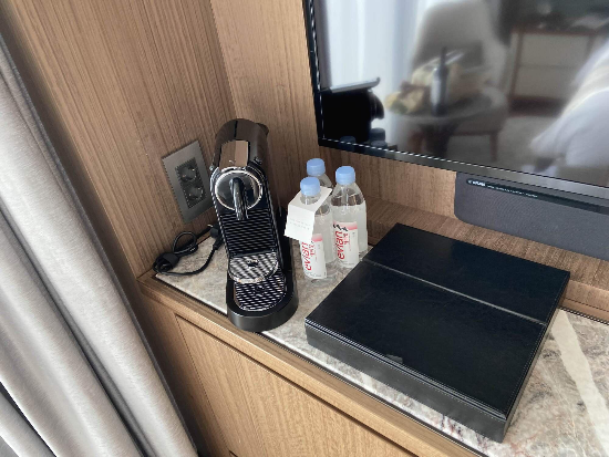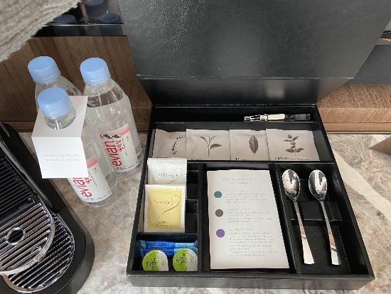 체크인 시 웰컴 티에 대한 안내를 받는다. 원하는 시간에 룸에서 웰컴 티를 마실 수 있다. 따뜻한 차와 전통과자로 구성되어 있다.