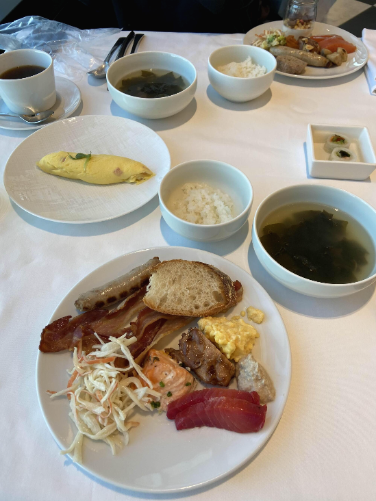 기본으로 미역국과 오믈렛이 제공되며 후식으로 커피가 제공된다. 그외의 음식과 디저트는 뷔페 형식으로 운영된다. 스테이 레스토랑의 아름다운 분위기에서 조식을 먹을 수 있다는 점이 좋았다. 음식의 종류도 굉장히 다양해서 만족스러운 조식이었다.