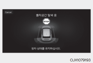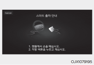 스마트 출차 기능 제어 중에 운전자가 주차/뷰 버튼에서 손을 떼면 차량은 멈추고 스마트 출차 제어는 일시적으로 중지한다. 운전자가 다시 주차/뷰 버튼을 누르고 있으면 원격 스마트 주차 보조가 스마트 출차 기능 작동을 다시 시작한다.