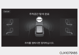 원격 스마트 주차 보조가 주차 공간 탐색을 완료하면 알림음과 함께 주차 공간 탐색 완료 안내문을 인포테인먼트 시스템 화면에 표시한다.