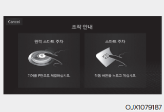 운전자가 주차유형을 선택하면 원격 스마트 주차 보조는 인포테인먼트 시스템 화면에 원격 스마트 주차 기능과 스마트 주차 기능 조작 안내를 표시한다.