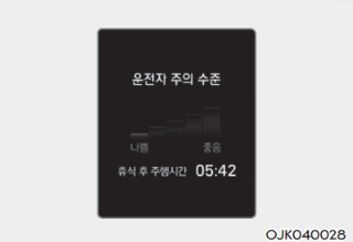 전방 주시 경고는 주행 중에 운전자가 전방을 주시하지 않는 시간, 눈 감음 시간, 하품 반복 여부 등을 종합하여 전방 주시 태만을 판단하며, 계기판에 경고를 표시하고 경고음이 울린다.
