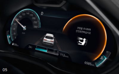 기본 모델의 운전자 주의 경고 기능은 주행 중 운전 패턴과 주행 시간 등을 판단하여 운전자의 주의 수준을 알려주는 기능이다. 반면, 하이테크 패키지의 전방 주시 경고 기능은 클러스터에 장착된 카메라를 통해 운전자의 얼굴 방향, 눈 감음 여부 등을 인식하여 전방 주시 태만을 경고하는 기능이다.