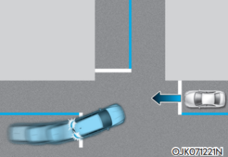 교차로 직진 시 좌/우측에서 다가오는 차량과의 충돌 위험이 판단되면 충돌하지 않도록 제동을 돕는다.