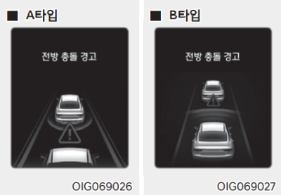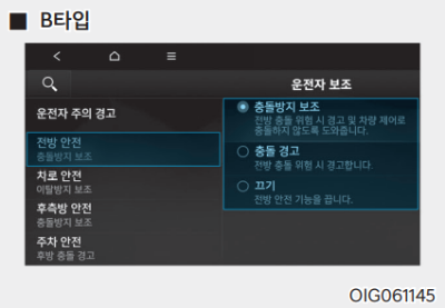 | 충돌 경고 | 충돌 경고를 선택하면 충돌 위험 상황에서 경고음만 작동한다. 브레이크 제어를 지원하지 않으므로 운전자가 직접 브레이크 페달을 조작해야 한다. |