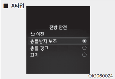 시동 ON 상태에서 계기판 / 인포테인먼트 시스템의 설정 메뉴에서 '운전자 보조 → 전방 안전'을 선택하면 전방 충돌 방지 보조 시스템을 설정하거나 해제할 수 있다.
