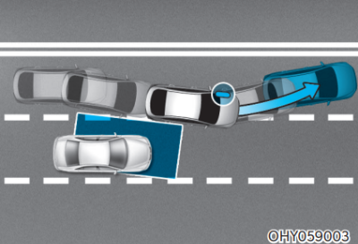 주행 중 자차의 차로를 이탈하여 차선을 변경할 때 자차 후측방에 접근하는 차량으로 인한 충돌 위험이 감지되면 편제동 제어를 하여 충돌 위험을 줄여 준다.
