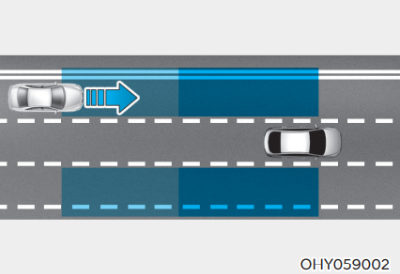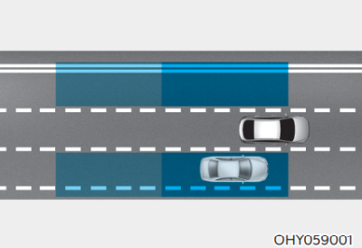 자차의 사각 지대에 위치한 차량을 감지하여 경고한다. 경고 영역은 자차의 속도에 따라 변경된다. 단, 자 차의 속도가 상대 차량을 빠른 속도로 추월할 경우 경고를 하지 않는다.