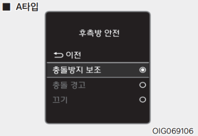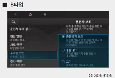 시동 ON 상태에서 계기판 또는 인포테인먼트 시스템의 설정 메뉴에서 '운전자 보조 → 경고 시점 / 경고 음량 / 후측방 안전'을 선택하여 각 기능을 설정할 수 있다.