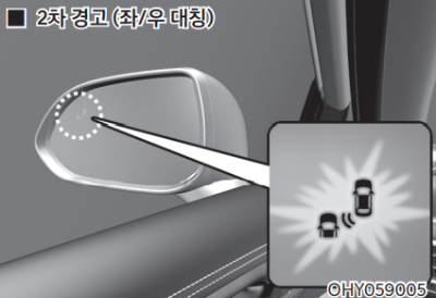 1차 경고 상태에서 차량이 감지된 방향으로 차로 변경을 위해 방향지시등 스위치를 작동하면 2차 경고가 작동한다. 2차 경고는 실외 미러 경고등과 헤드업 디스플레이 경고등이 깜빡인다. 계기판에는 경고문을 표시하고 동시에 경고음이 작동하며 스티어링 휠이 진동하여 운전자에게 알린다.