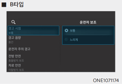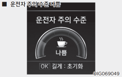 시동 ON 상태에서 계기판 또는 인포테인먼트 시스템의 설정 메뉴에서 '운전자 보조 → 운전자 주의 경고 → 부주의 운전 경고'를 선택하면 운전자 주의 경고 시스템이 작동한다.
