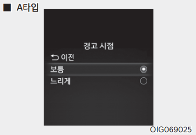 시동 ON 상태에서 계기판 또는 인포테인먼트 시스템의 설정 메뉴에서 '운전자 보조 → 운전자 주의 경고 → 전방 차량 출발 알림'을 선택하면 전방 차량 출발 알림 기능이 작동한다.