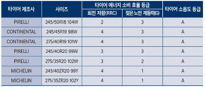 19인치 콘티넨탈 휠 & 타이어는 회전 저항이 4등급으로 낮은편이며, 젖은 노면 제동력은 3등급으로 중간 정도이다. 20인치 피렐리 휠 & 타이어는 회전저항이 3등급으로 중간 정도이며, 젖은 노면 제동력은 2~3등급으로 좋은 편이다.