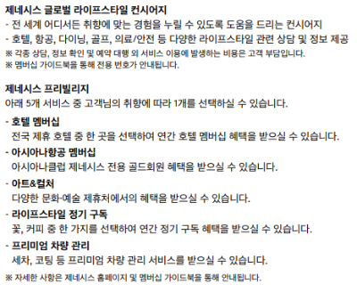 제네시스 프리빌리지는 5개의 서비스 중에 1개를 선택할 수 있다. 호텔 멤버십, 아시아나 항공 멤버십, 아트&컬처, 라이프스타일 정기 구독, 프리미엄 차량 관리가 있다.