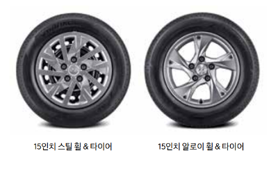 | 타이어 & 휠 | 15인치 스틸 휠 & 타이어 | 15인치 알로이 휠 & 타이어 | 16인치 알로이 휠 & 타이어 |