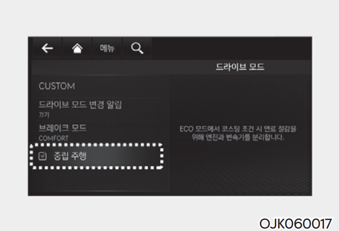 다만 중립 주행 기능은 컴포트 / 스포츠 모드에서 사용할 수 없다. 드라이브 모드를 에코 모드로 설정할 경우 자동으로 중립 주행 기능을 사용할 수 있다.