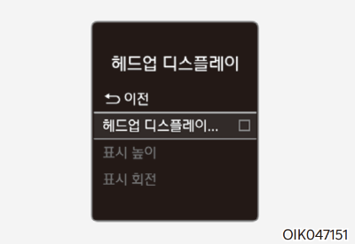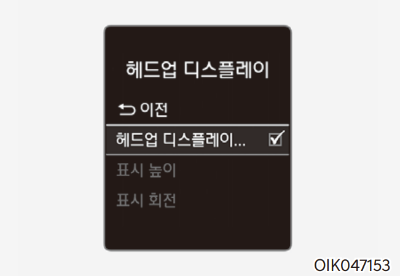 시동 ON 상태에서 계기판의 사용자 설정 모드에서 헤드업 디스플레이를 설정/해제할 수 있다.