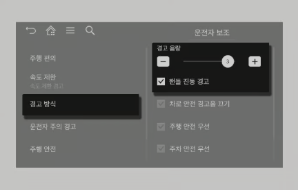 또한 설정을 통해 경고 방식을 조절할 수 있습니다. 경고 방식은 경고 음량, 핸들 진동 경고를 설정할 수 있습니다.