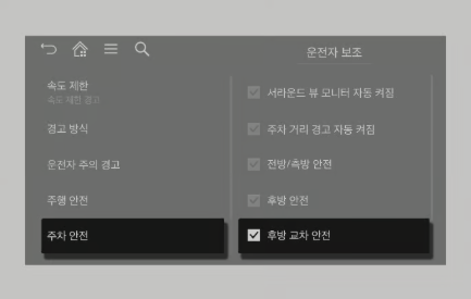 시동이 켜진 상태에서 인포테인먼트 시스템의 설정 → 차량 → 운전자 보조 → 주차 안전 → 후방 교차 안전을 차례로 선택하면 후방 교차 충돌방지 보조 기능을 켤 수 있습니다.