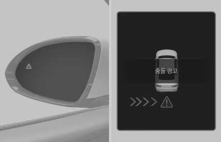 후진 시 후측방에 차량이 지나가 충돌 위험이 있을 경우 사이드 미러(실외 미러) 경고등, 경고문, 경고음, 스티어링 휠 진동을 통해 긴급 제동을 알립니다.