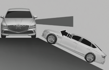 오르막길이나 내리막길, 또는 그 근처에서는 후측방에서 접근하는 차량을 인식하지 못해 후방 교차 충돌방지 보조가 경고하지 않거나 제동을 도와주지 않을 수 있습니다.