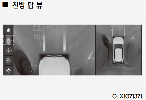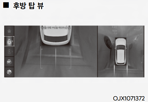 | 탑 뷰 주차 가이드 | 표시 정보의 탑 뷰 주차 가이드라인이 선택되어 있는 경우, 전방 탑 뷰 또는 후방 탑 뷰 작동 시 서라운드 뷰 모니터 화면 우측 탑 뷰에 탑 뷰 주차 가이드라인이 표시됩니다. |